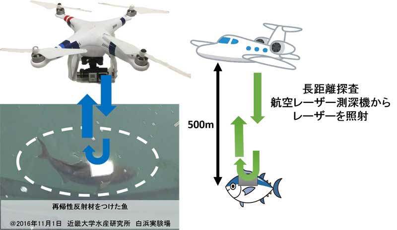 これまでに近大水産研究所 白浜実験場(和歌山県)のいけすを使った実証実験では、ドローンを使った地上数m~数十m間や上空500mの長距離探査航空機からレーザーを照射し、反射材を付けたマグロのリアルタイム観測・調査に成功。今後は、上空300kmの宇宙空間にある人工衛星からのレーザー照射による生態調査を最終目標に、超小型人工衛星「宇宙マグロ」を製作し、2019年度中の打ち上げを予定している。