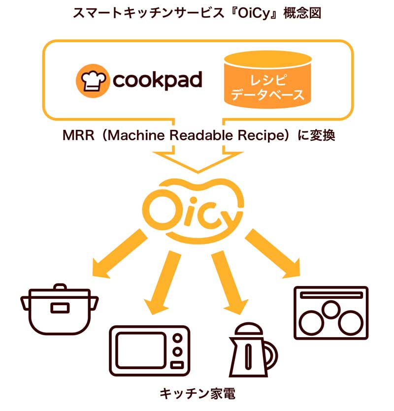 「OiCy」の概念図。クックパッドに掲載されたレシピを機器が読み込める形式に変換し提供することで、膨大なレシピの再現がいとも簡単にできるようになる