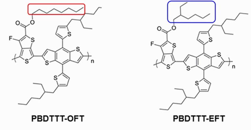 PBDTTT-OFTは、従来の有機太陽電池で広く用いられてきた「PBDTTT-EFT」と似た構造を持つが、PBDTTT-EFTにはない直線状の側鎖(そくさ:鎖式化合物の分子構造で,最も長い炭素原子の連鎖から枝分かれしている部分)を有する。この構造により、高い結晶性を持つ膜が形成でき、加熱による導電性の低下が避けられるとのこと。