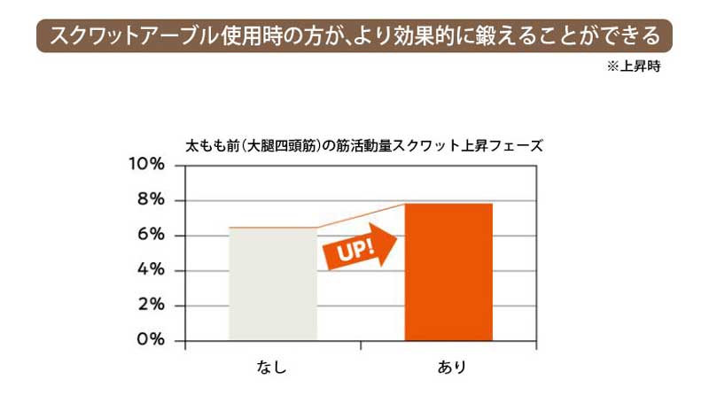 ミズノが行った実証実験では、上昇時に太もも前側とお尻の筋肉に表れる運動・消費エネルギー効果は、通常のスクワットと比べて同等以上、運動強度の判断材料に用いられる心拍数に至っては「スクワットアーブル」を使用した方が低く安定しているという結果が得られている。