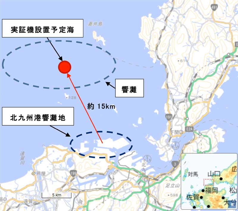 「ひびき」は、日立造船株式会社堺工場(大阪府)から福岡県北九州港までの曳航が完了し、今後、北九州港響灘地区で2枚翼のアップウインド型3MW風車を搭載する。その後、ことしの夏ごろに同地区から約15km離れた響灘に係留および電気ケーブルを接続し、秋ごろから実際に発電を行う実証運転が開始される予定とのこと。