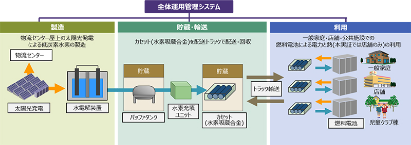 発電した電力は水電解装置で水を水素に変換し、冷却・加圧で吸収、加熱・減圧で放出する仕組みの水素吸蔵合金カセットに貯蔵する。その後、みやぎ生協の既存物流ネットワークを活用して、富谷市内にあるみやぎ生協組合員の家庭3軒、みやぎ生協の店舗や市立日吉台小学校児童クラブ棟に配送。