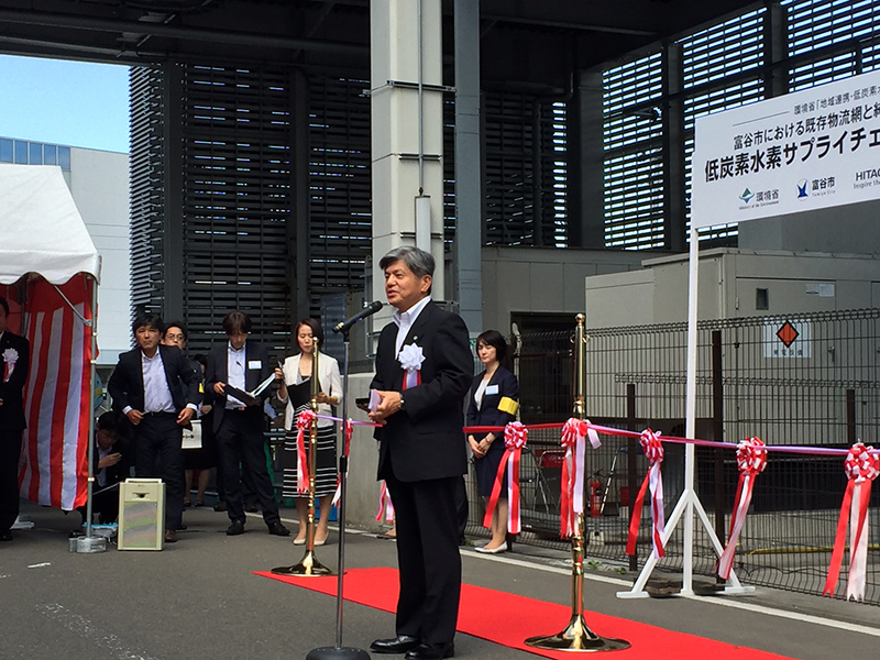 8月3日にみやぎ生協富谷共同購入物流センターで行われた運用開始式には、土井 亨復興副大臣や村井嘉浩宮城県知事、若生裕俊富谷市長をはじめ多くの関係者が列席。その中で、水素を充填(じゅうてん)した水素吸蔵合金カセットを富谷市立日吉台小学校児童クラブ棟に配送し、燃料電池に取り付けるまでの一連の工程が会場内のモニターで生中継された。