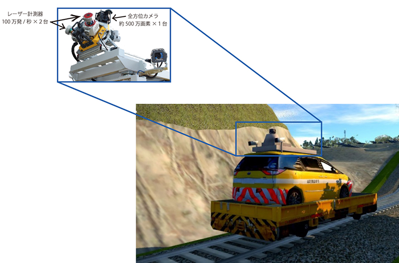 実証実験では、レーザースキャナや全方位カメラを搭載した移動計測車両 MMS(モービル マッピング システム)を鉄道台車に装着。軌道を走りながら、レールの形状やトンネルの内面形状、橋梁の上部形状、レール周辺の斜面、プラットフォームの形状などをレーザー計測していく。