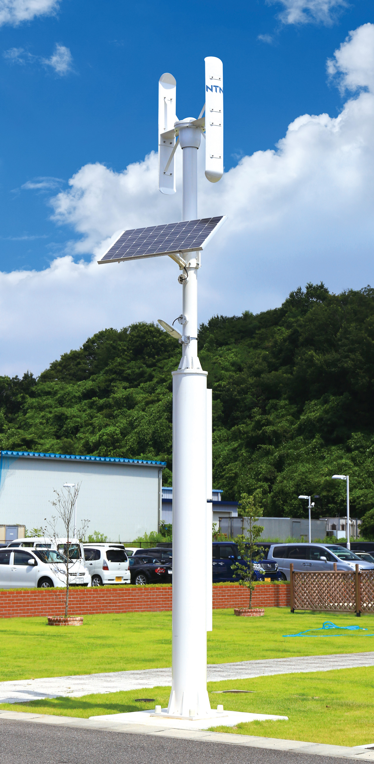 他にもNTNは、われわれの生活圏でさりげなく活躍する発電装置を販売している。風力発電機と太陽光パネルを組み合わせた、独立電源型の「ハイブリッド街路灯」だ。