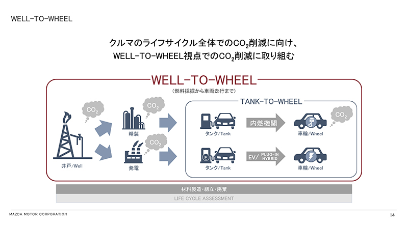 石油が採掘されてから、クルマが走行するまで、どの過程でCO2を排出しているか示した図。マツダでは、電気自動車の導入を促進するだけではなく、ライフサイクル全体でのCO2削減に取り組むことが重要と考えている