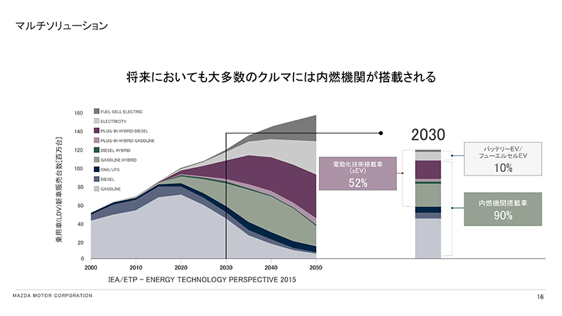 つまり、従来の内燃機関の理想を追求する戦略に変更はなく、2030年に全ての車に内燃機関をサポートする電動化技術を搭載したxEV化を目指すというのがマツダの方針だ。