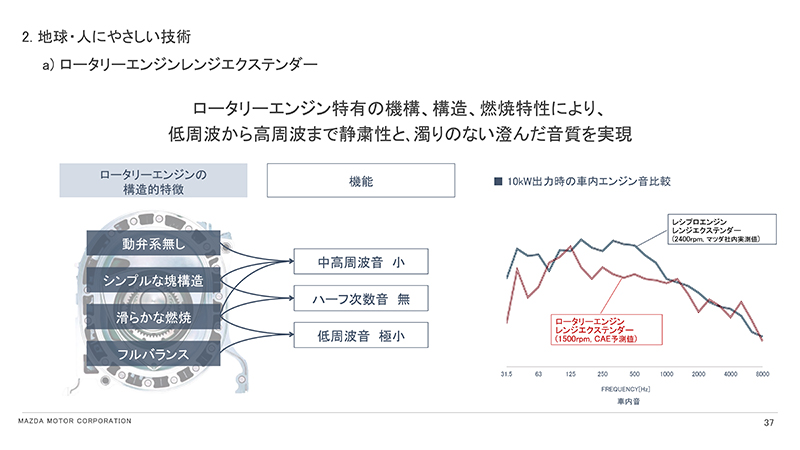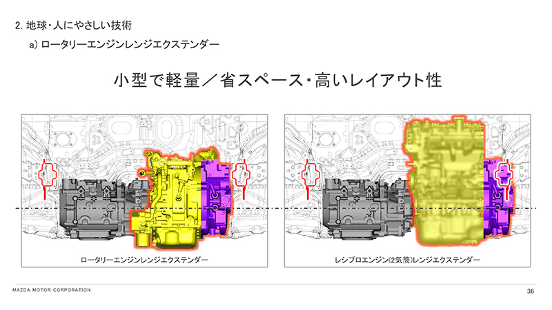 そこで浮上してきたのが、マツダの代名詞ともいえるRE(ロータリーエンジン)を活用して発電する“REレンジエクステンダー”であり、同社では解決策の一つになると考えている。