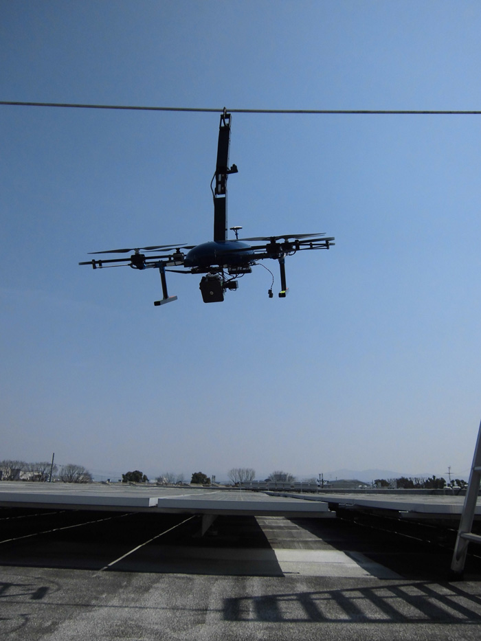 有線信号での操縦も可能。高圧電線の点検で使う際に、電磁波の影響で操縦困難になることを回避できることがメリットだ。