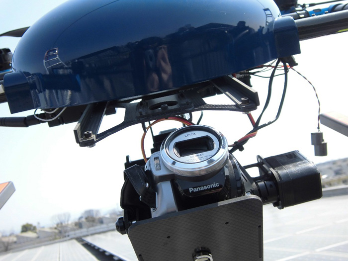 点検を担うカメラは、ジンバル(カメラ固定用の部材)によって、撮影する方向を変えられる。点検対象物がドローンの真上にある場合でも撮影することができる。