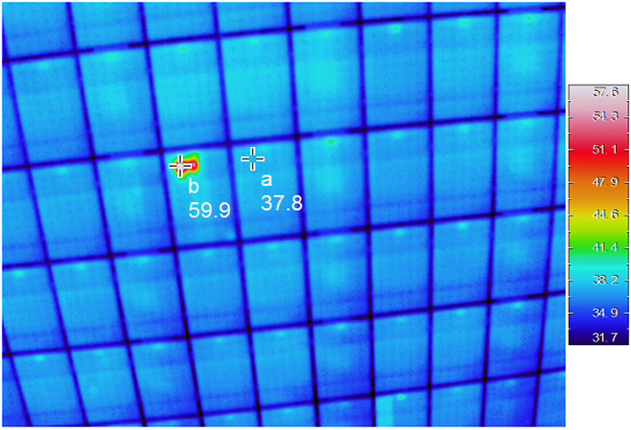 赤外線カメラで点検できるのは、ホットスポットと呼ばれる太陽光パネルの異常箇所。パネルの割れやゴミなど、発電効率に悪影響を与える原因を早期発見できる。