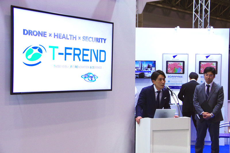 幕張メッセで開催された「Japan Drone 2017」(3月23~25日)で、総合ビル管理業務を手掛ける大成株式会社が、ドローンによるオフィスの巡回監視サービス「T-FREND」を参考展示した。