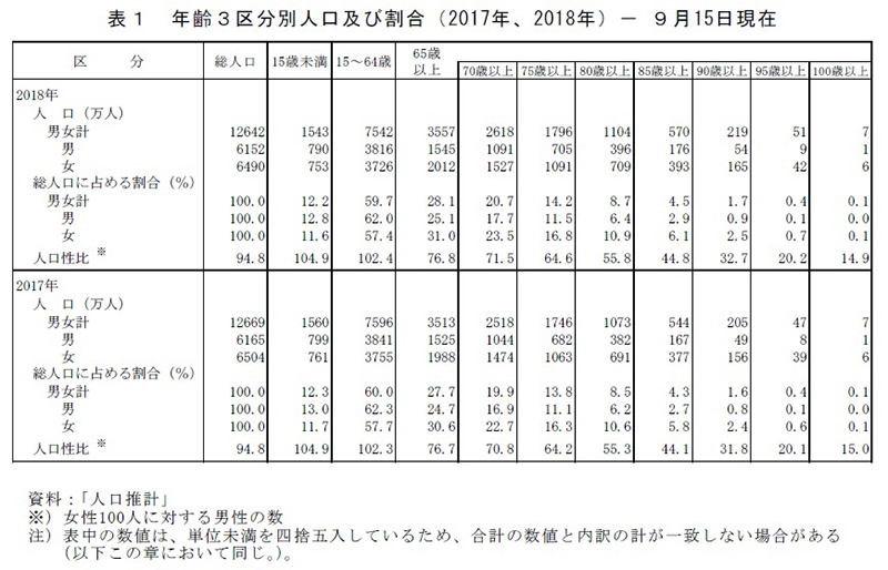 総務省統計局が発表した人口および割合の図。2017年と比べ、若年層が減少し、高齢層が増加傾向にあることが分かる