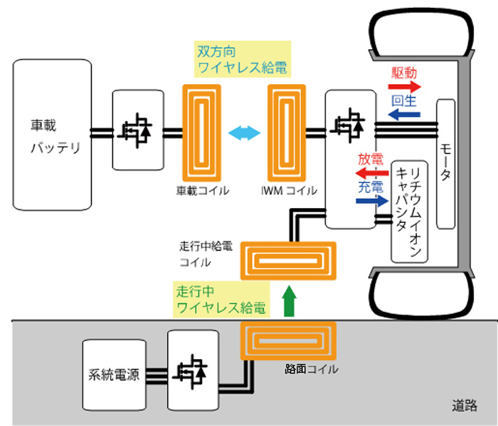 ワイヤレス・インホイールモーターの概要。モーターを挟むように上下にあるのは、タイヤの断面を表している。IWMは路面コイルからの給電と、車載バッテリーからの給電を受けて駆動する