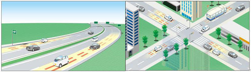 走行中に道路から給電するイメージ図。左は高速道路、右は市街地(出典:東京大学大学院 新領域創成科学研究科 堀・藤本研究室)