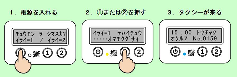 例えば、「[1]を押すと自宅に迎車」「[2]を押すと病院に迎車」など迎車場所が2つまで登録可能で、ボタンを1回押せば到着時間・号車番号が液晶画面に表示され、指定の場所にタクシーがやって来る。さらに行き先の登録(任意)も可能。自宅から病院までの往復のように、高齢者や妊婦の定期的な通院の場合、毎回同じ行き先を伝える必要がなく、ボタン操作のみで配車依頼から行き先指定までをオールインワンで済ますことができるという。