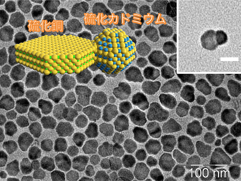 透過型電子顕微鏡による硫化銅/硫化カドミウムヘテロ構造ナノ粒子の断面(画像の下部)。左上部の図は、硫化銅と硫化カドミウムの接合構造を表した赤外応答光触媒のイメージ。また、右上部は赤外応答光触媒を一つだけ取り出したもの