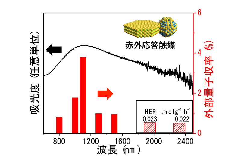 一つは、金ロッドなどを用いた赤外光の水素生成では0.3~1.4%だった外部量子効率が、硫化銅/硫化カドミウムヘテロ構造ナノ粒子では3.8%という世界最高効率で水素を生成できる光触媒であること。