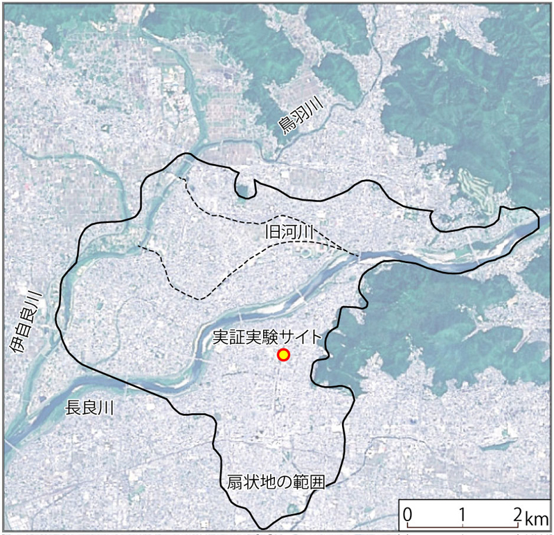 今回、実証実験が行われた長良川扇状地。多数のボーリングを用いて地下水の流れを正確に把握するとともに、図中の丸印の地点で実証実験を行った