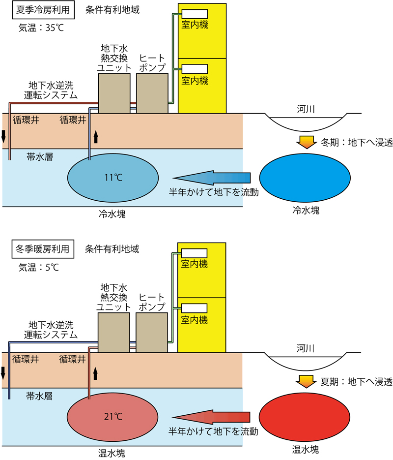 オープンループ型地中熱利用空調システムを活用した条件有利地域(長良川扇状地)での地下水特性利用イメージ