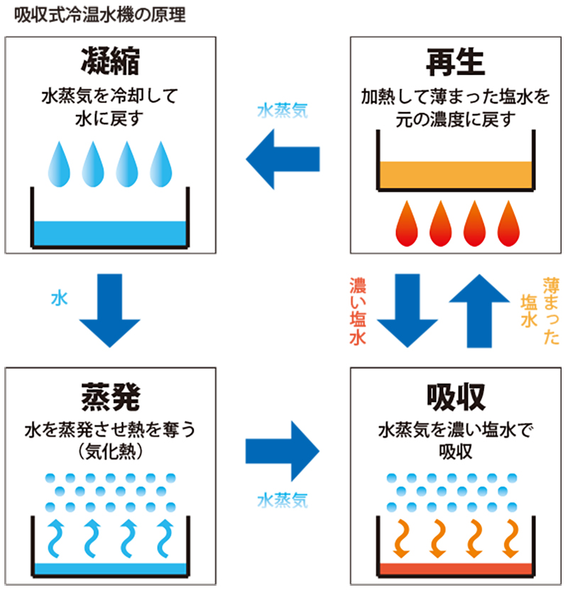 従来、地中熱利用空調システムに採用されている吸収式冷温水機の原理。“蒸発”“吸収”“再生”“凝縮”の4サイクルで冷水および温水を得る仕組み