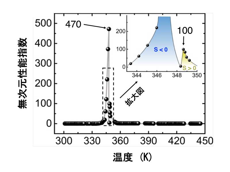 今回開発された熱電材料を測定した結果。無次元性能指数の最大値は従来値の180倍となる470に到達していることが分かる