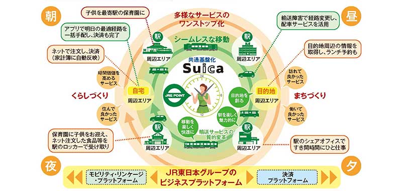 JR東日本が発行するICカード「Suica」を利用した多様なサービスのワンストップ化である。