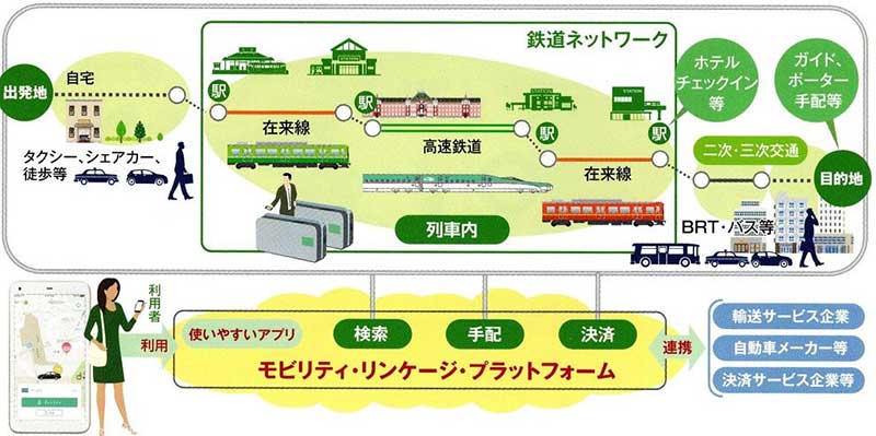 移動だけでなく、目的地周辺での食事や駅構内のシェアオフィス、駅型保育園の利用、観光などを、一つの予約、決済手段でより便利に利用できるようにする構想だ。