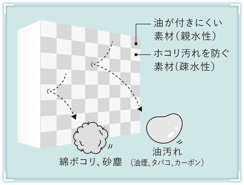 「すると付着した汚れが親水性のものであっても疎水性のものであっても、それぞれに対応した素材に触れることで不安定な状態になり、気流や振動によって剥がれやすくなるのです」