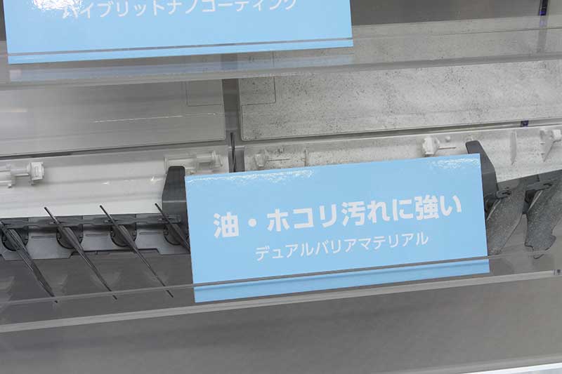 体験型ショールームにはハイブリッドナノコーティングとデュアルバリアマテリアルという、三菱電機のエアコンを代表する技術が展示されている
