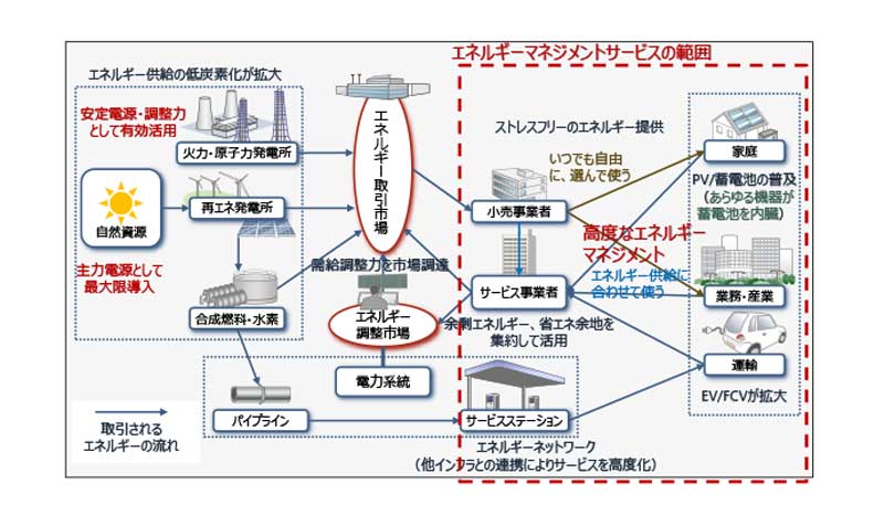 発電所によって作られた電力を、独立したエネルギー調整市場が介在して安定化させるエネルギーマネジメントサービスの将来像