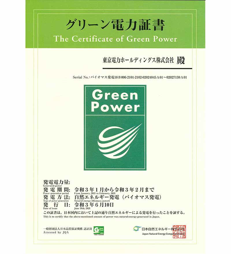 ※グリーン電力証書=自然エネルギーにより発電された電気の環境付加価値を取引できるようにするための証明書。証書発行事業者(東京電力グループの日本自然エネルギー株式会社など)が第三者認証機関(一般財団法人日本品質保証機構)の認証を得て発行する